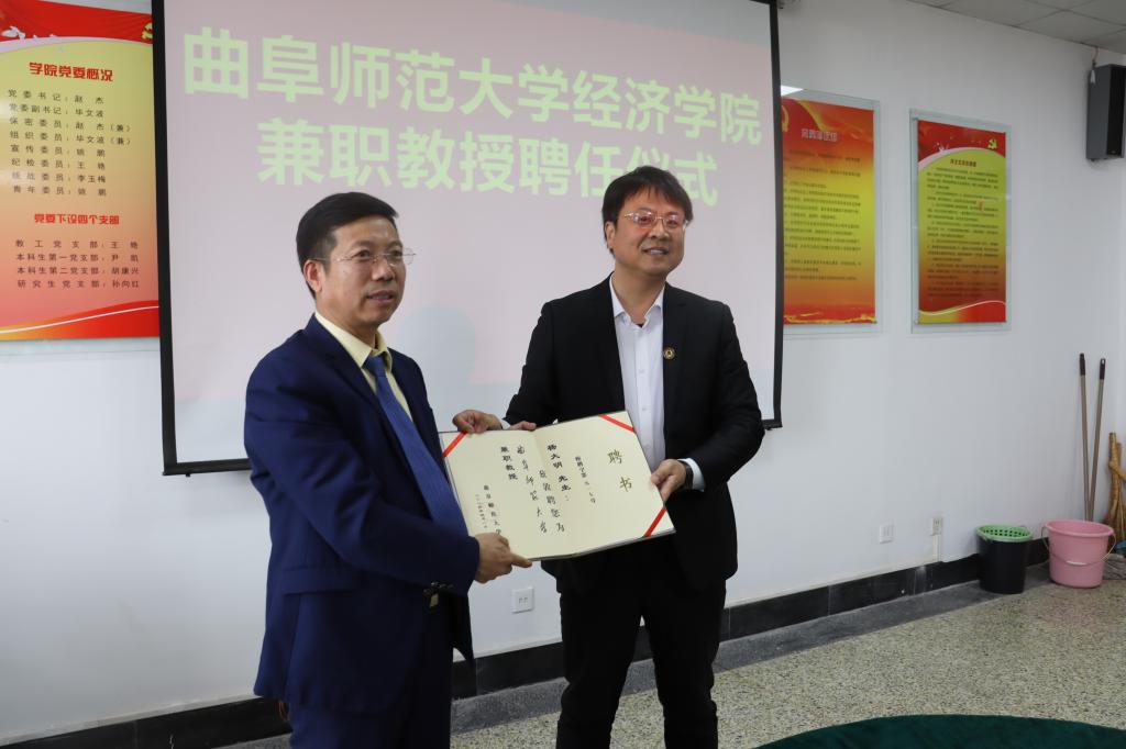 曲阜师大经济学院讯  5月7日下午,曲阜师范大学经济学院举行兼职教授聘任仪式,学校党委副书记李志红出席仪式,党委常委、副校长刘刚为商道企业集团董事长杨大明颁发兼职教授聘书。