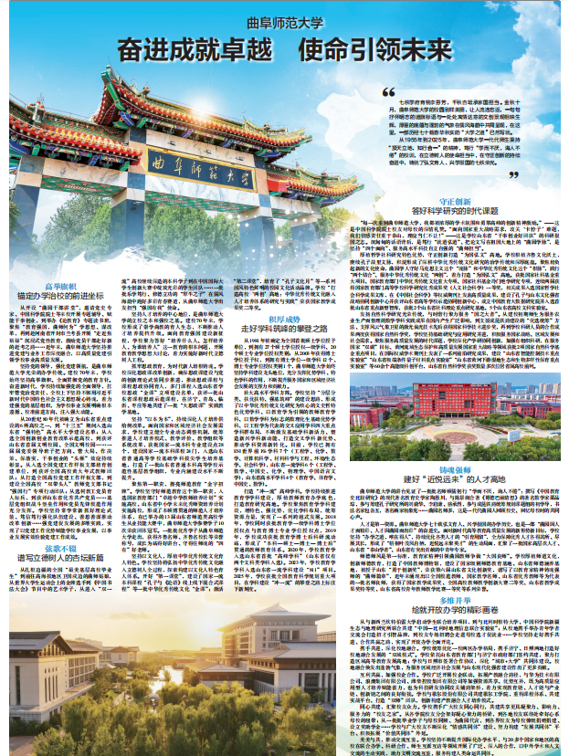 “每一次重回曲阜师范大学,我都被浓厚的学术氛围和勇攀高峰的创新精神激励。”——这是中国科学院院士校友对母校的深情礼赞。“面向国家重大战略需求,攻关‘卡脖子’难题,我们倍感责任重于泰山,理应当仁不让!”——这是学校山东省“干事创业好团队”的科研报国之志。沉甸甸的话语背后,是笃行“就道弘道”、把论文写在祖国大地上的“曲园学脉”,是坚持“四个面向”、服务高水平科技自立自强的“曲师担当”。