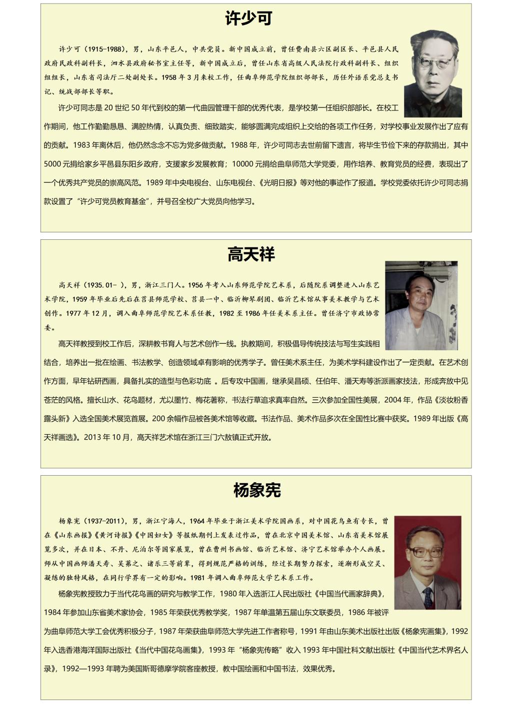 为迎接70年华诞,曲阜师范大学档案馆推出“70年突出贡献人物”专栏。这些先进人物中,有高瞻远瞩、科学决策,带领学校把握机遇、实现跨越式发展的学校领导;有在教育一线默默耕耘、以高尚的师德师风影响了一代又一代学子的优秀教师;有在科研领域不断探索、勇攀高峰、为学科发展做出杰出贡献的科学家;有在文化传承与创新上独树一帜、为弘扬中华优秀传统文化做出积极努力的艺术家;还有在社会服务与公益事业中发光发热、用实际行动践行社会责任的杰出曲园人。