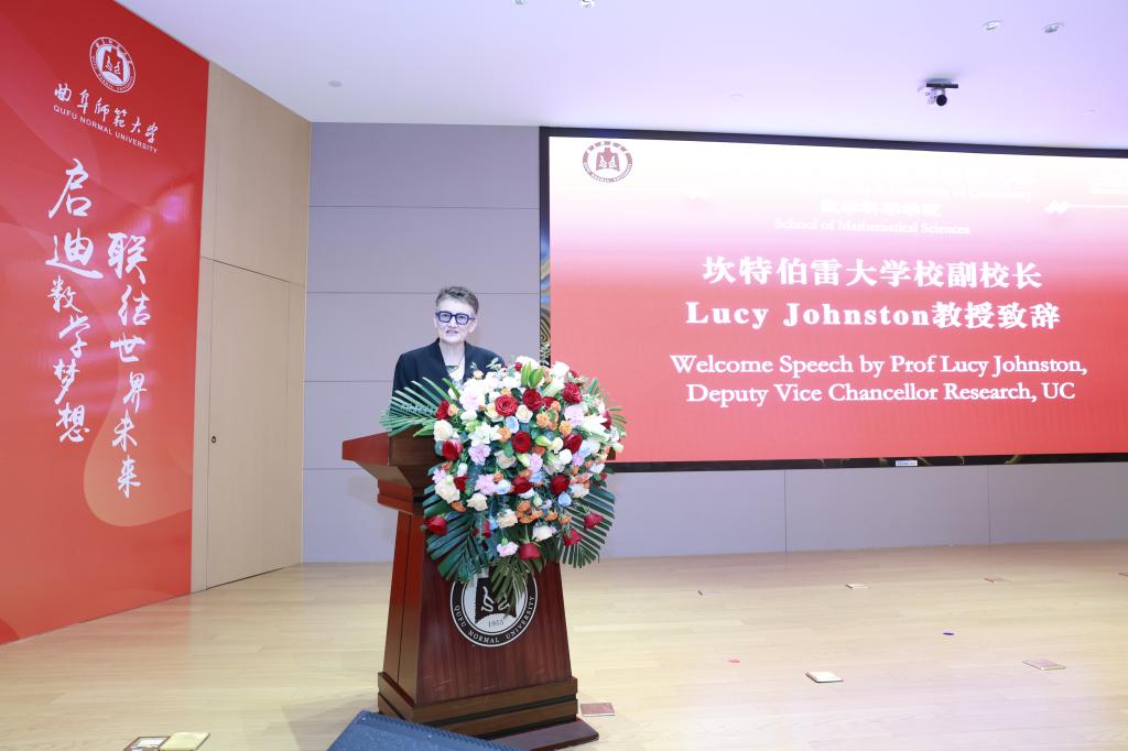 坎特伯雷大学副校长Lucy Johnston教授向在场师生、家长致以诚挚问候。她介绍了坎特伯雷大学数学专业的课程设计和特色,表达了对曲阜师范大学—坎特伯雷大学项目的大力肯定与支持。她勉励首届学生作为项目先驱,珍惜机遇,砥砺前行,开启变革性的求学旅程。