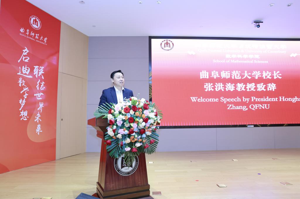 张洪海在致辞中向坎特伯雷大学校方领导老师、澳大利亚未来教育研究院代表和学生家长表示热烈欢迎,并向历经拼搏开启大学新篇章的同学们表示祝贺。他指出,数学与应用数学中外合作办学专业是学校首个理工科中外合作办学项目,项目依托的曲阜师范大学数学学科作为学校创校学科之一,已形成完整的本硕博人才培养体系,希望同学们能够立鸿鹄志、做追梦人,勇于创新、敢为人先;修身明德、全面发展,放眼世界、融通中外,主动成长为专业精、素养高、视野宽的国际型数学科学人才,用奋斗书写无愧于时代的青春篇章。