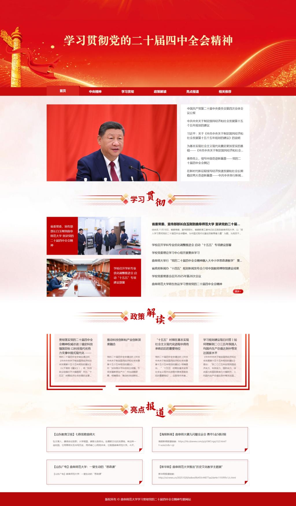 党委宣传部讯 根据学校党委工作部署,日前,曲阜师大党委宣传部专门推出“学习贯彻党的二十届四中全会精神专题网站”,为全校师生搭建起权威、系统、便捷的理论学习平台,让全会精神在曲园落地生根。