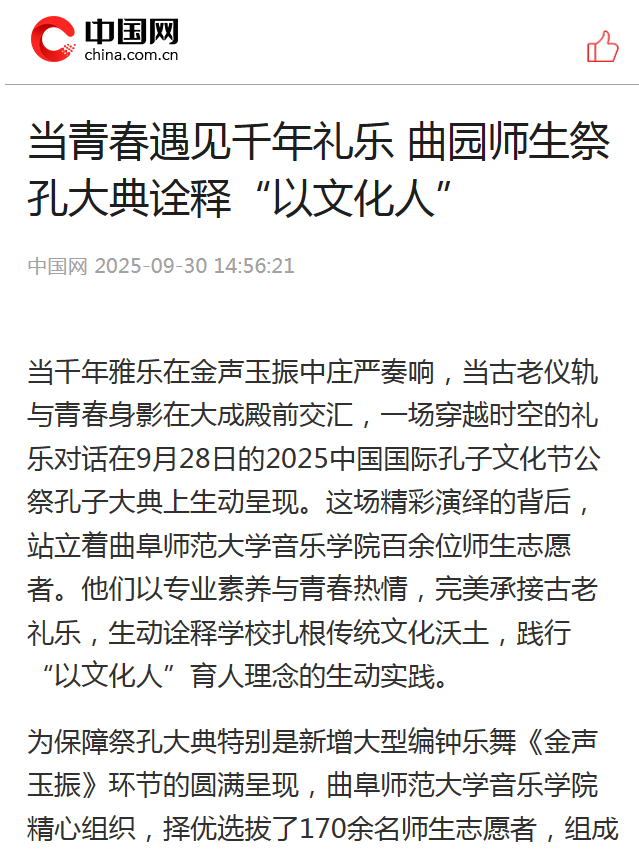 当千年雅乐在金声玉振中庄严奏响,当古老仪轨与青春身影在大成殿前交汇,一场穿越时空的礼乐对话在9月28日的2025中国国际孔子文化节公祭孔子大典上生动呈现。这场精彩演绎的背后,站立着曲阜师范大学音乐学院百余位师生志愿者。他们以专业素养与青春热情,完美承接古老礼乐,生动诠释学校扎根传统文化沃土,践行“以文化人”育人理念的生动实践。