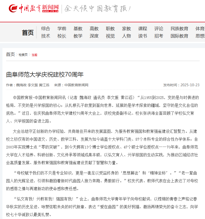大会总结守正创新的办学经验,共商继往开来的发展蓝图,为服务教育强国和教育强省建设汇智聚力。从建校之初仅有的中国语文、历史、数学三科,发展为如今涵盖十大学科门类、87个本科专业的综合性办学体系;自2003年实现博士点“零的突破”,到今天拥有13个博士学位授权点、47个硕士学位授权点……70年来,曲阜师范大学在人才培养、科研创新、文化传承等领域成果丰硕,以弘文育人、兴学报国的生动实践,为推动区域经济社会高质量发展、服务教育强国和教育强省建设贡献了智慧和力量。
