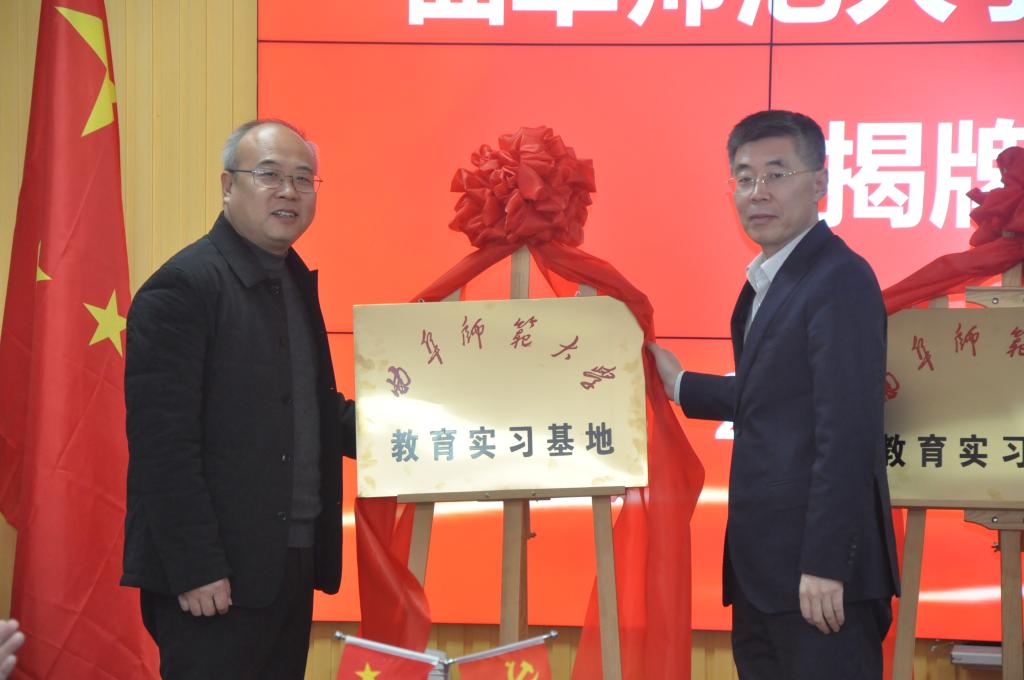 化学与化工学院院长冯媛媛和三所中学的负责人分别签署了《教育实习基地协议书》,党委书记赵琪和微山县教体局局长王志刚共同为“曲阜师范大学教学实习基地”揭牌。