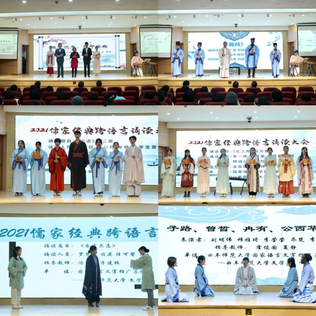 由中国孔子基金会、尼山世界儒学中心、山东省教育厅共同主办,教育部语言中心等单位承办的“2021儒家经典跨语言诵读大赛”,全球共有40多个国家参与,3200多个作品参赛。曲阜师范大学国家语言文字推广基地和文学院精心制作、报送6个作品,获得多个奖项。其中,霍俊国、孙晓伟老师指导的李一婷团队作品经过线上直播展演、专家二次品鉴等多个环节,从3200多个作品中脱颖而出,进入前十名,获得“优秀演绎作品”奖,并受邀参加在山东教育电视台举行的颁奖典礼。